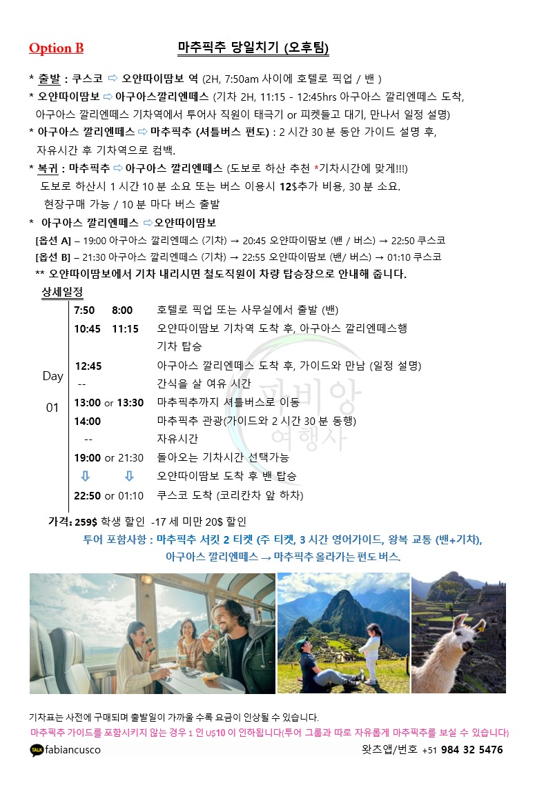 이 상품의 장점은 하루안에 마추픽추를 구경하실 수 있으며